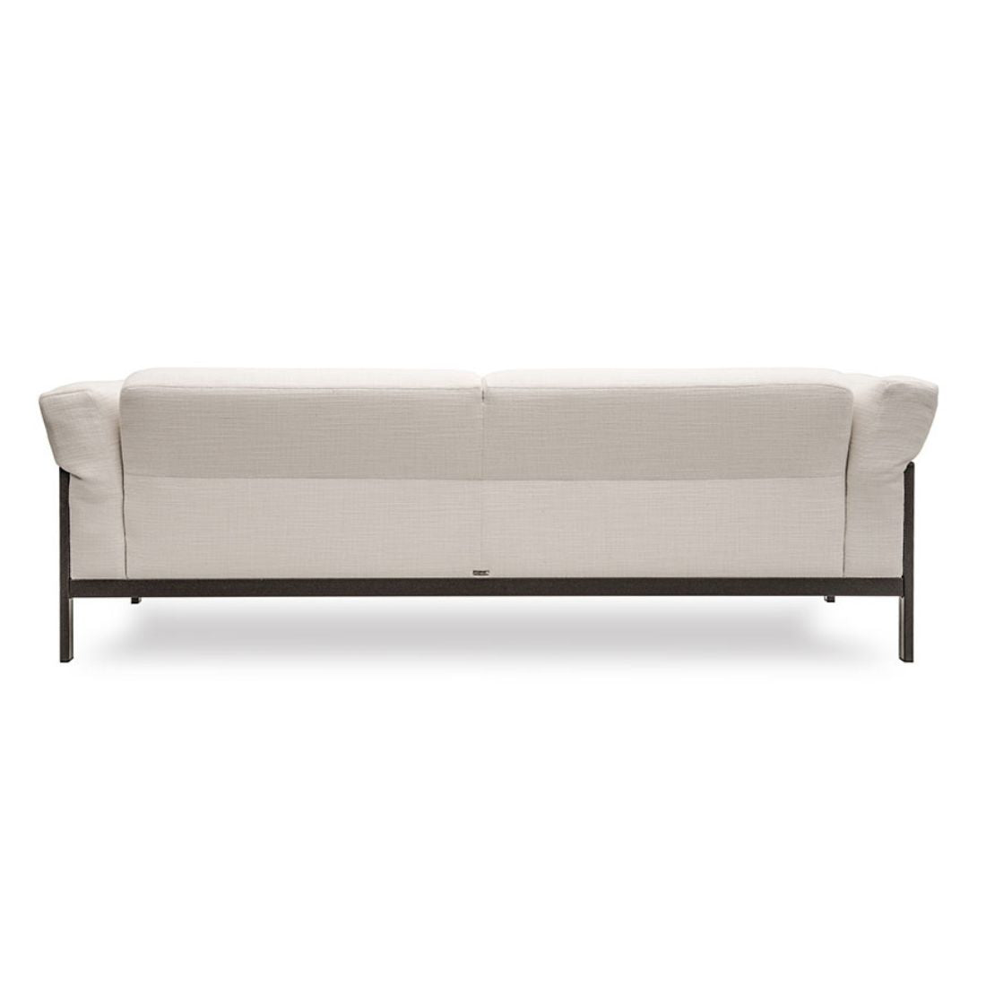 Simple and masculine in form, the imposing steel frame is striking from a distance while providing industrial strength in functionality. This frame sets up a surprising contrast to the comforting lines of the cushioning, which combines feather and foam.