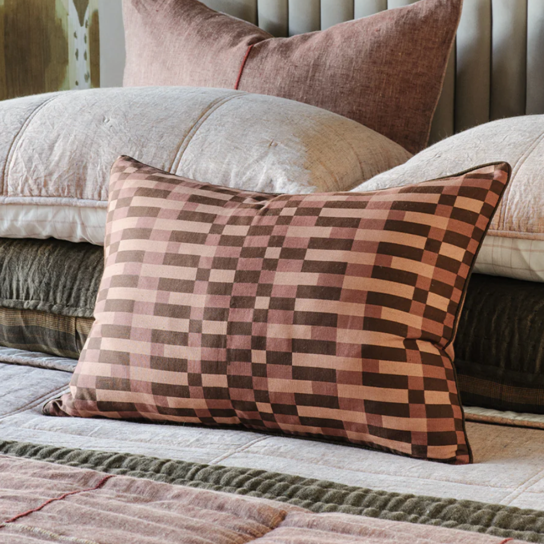 Meaning 'brick' in Italian, the Mattone's hand-blocked printed pattern is a stylised representation of weaving, a time-honoured artisanal craft. The beauty of hand block printing lies in its subtle imperfections creating slight variations in colour and pattern making each cushion unique. bringing warmth, character, and authenticity to your home décor.